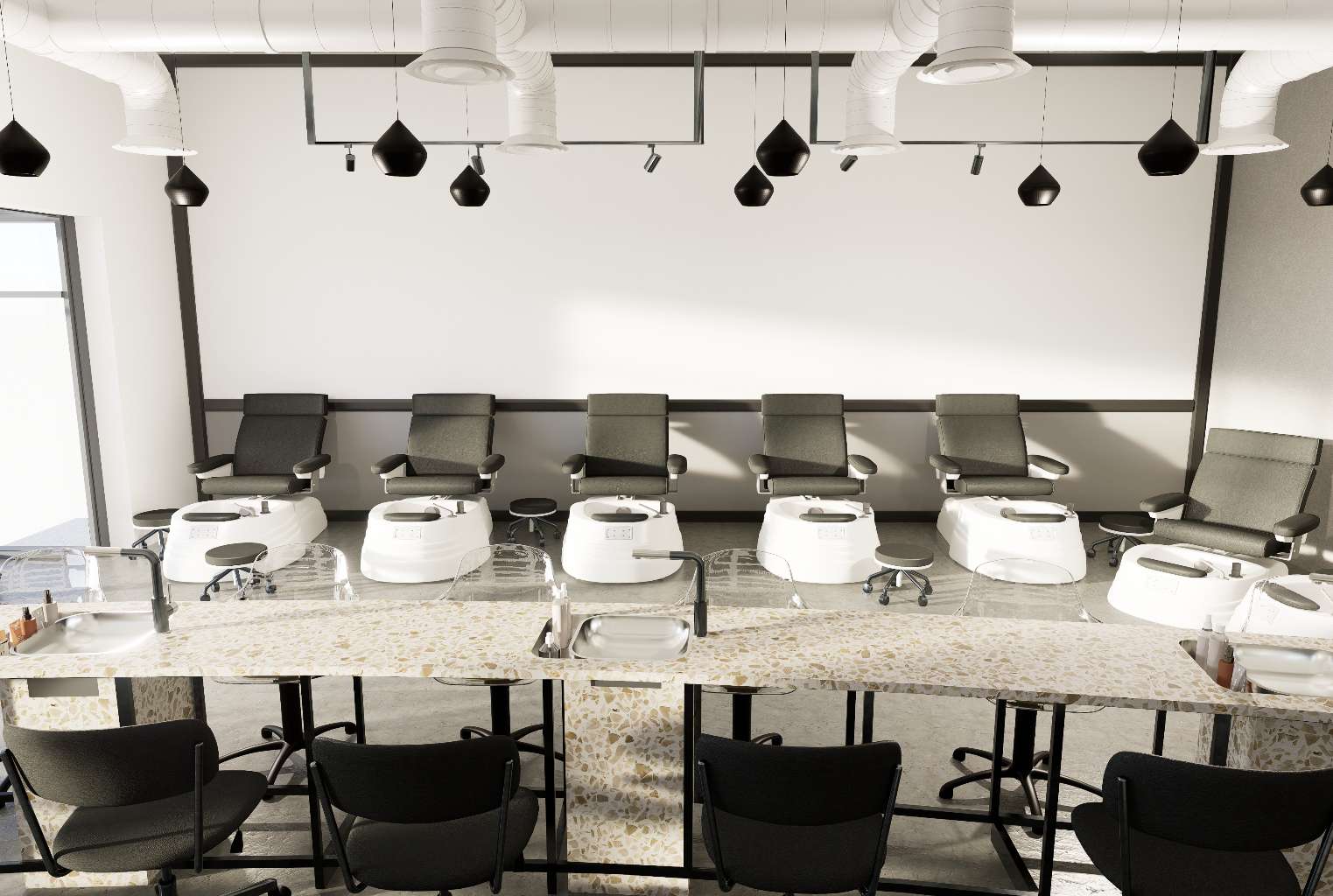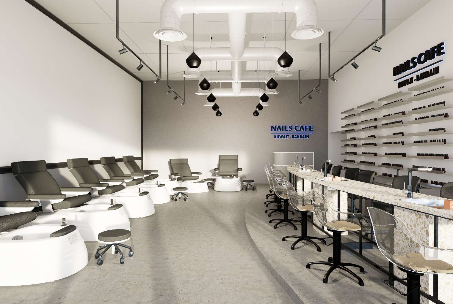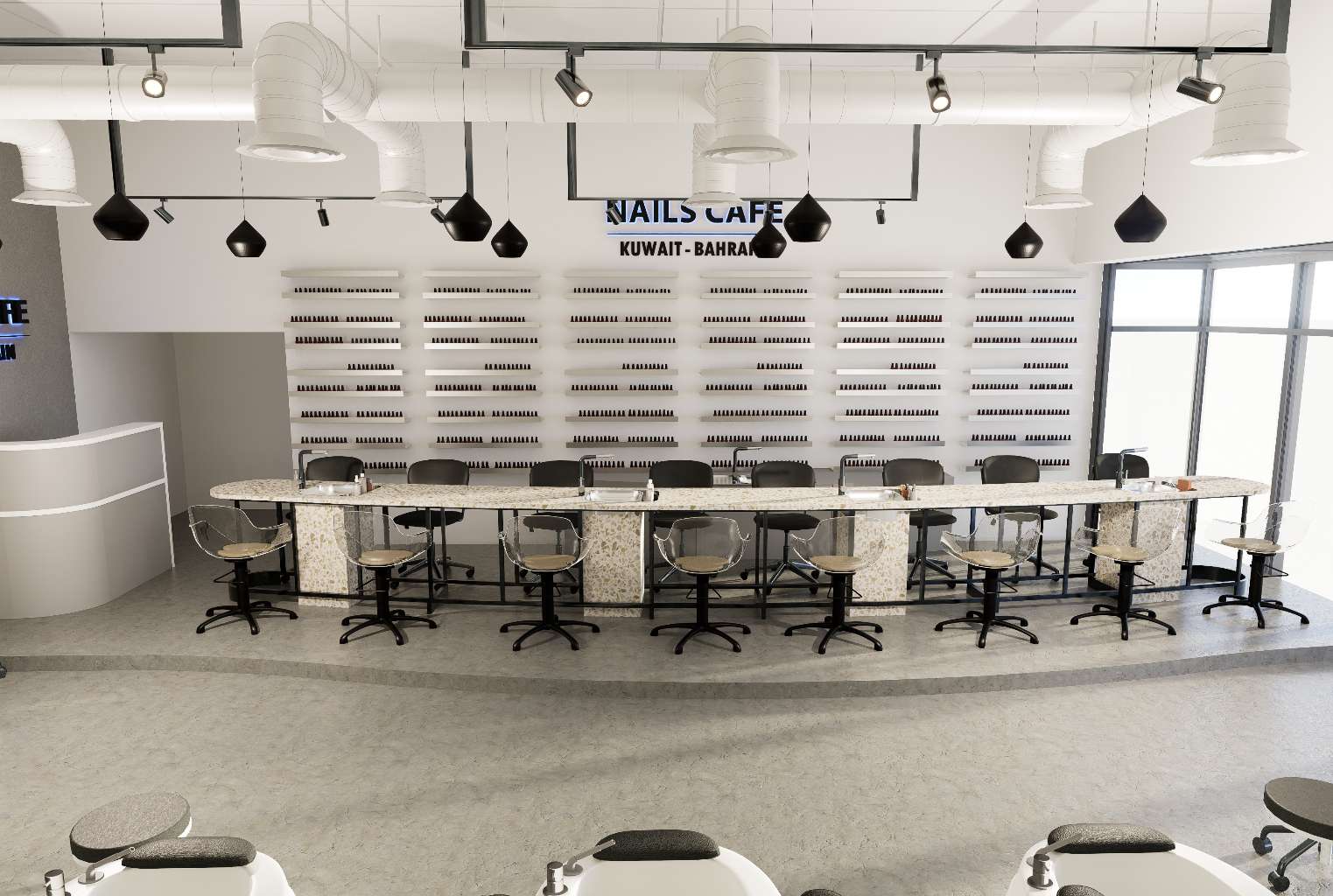 A curvilinear nail table serves as the focal point of the space, contrasting with the strong industrial elements and adding softness and movement to the design. Shelving positioned behind the nail station enhances both functionality and visual interest.