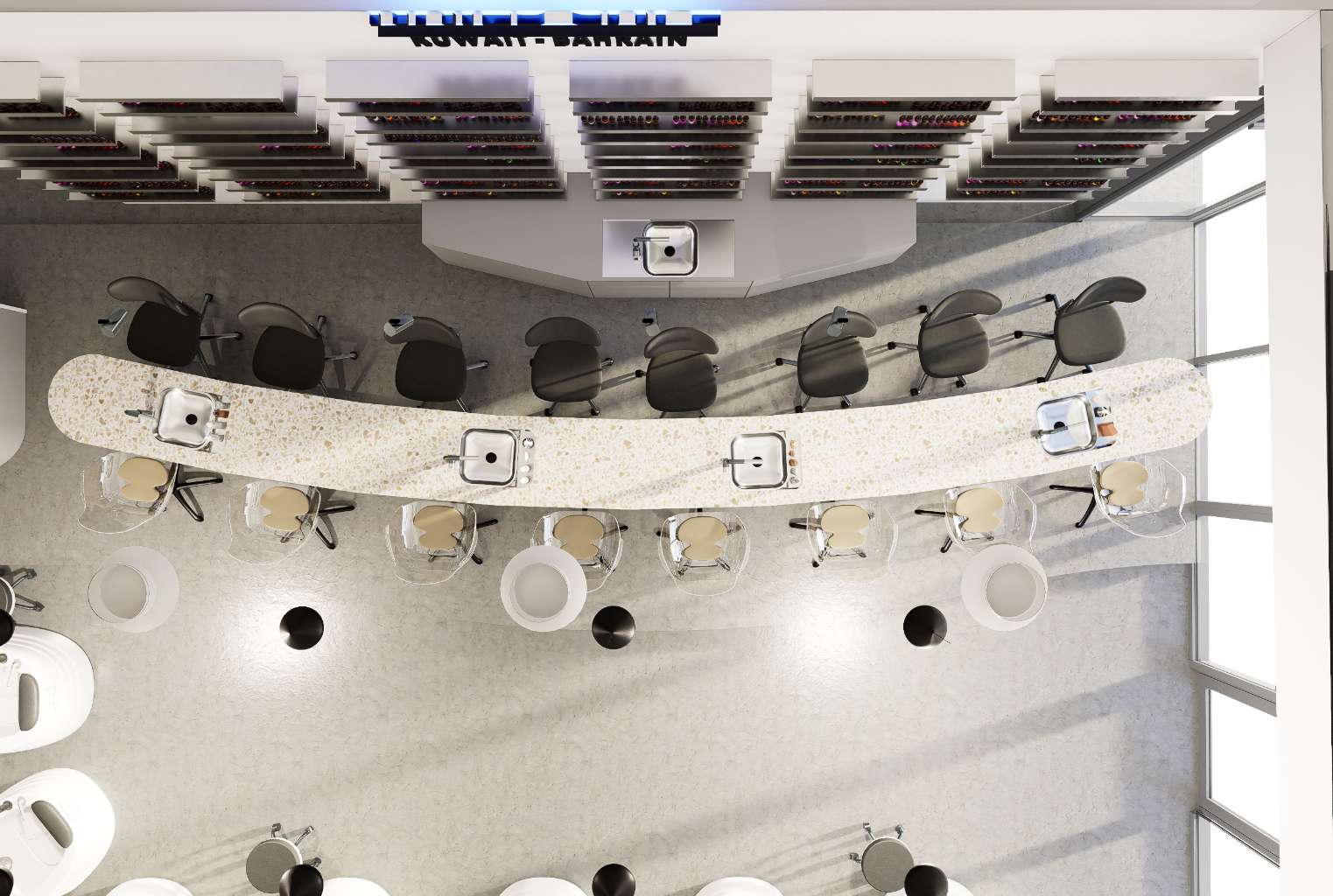 To make the salon feel larger and more open, the layout avoids physical partitions. Instead, zoning is achieved through furniture arrangement, lighting, and material transitions. Carefully selected materials give the salon its unique identity, resulting in a bold, modern, and cohesive space.