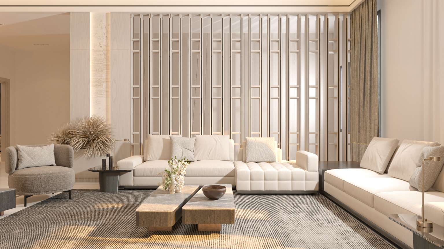 وقد تم الاهتمام بتناسق الإضاءة والمواد واختيار الأثاث بعناية لضمان الانسجام والاستمرارية في جميع عناصر الفراغ. وبشكل عام، يهدف التصميم إلى تقديم بيئة معيشية عصرية بطابع خالد تجمع بين الراحة والفخامة، وتوفر أجواء مرحبة تناسب الاستخدام اليومي واستقبال الضيوف.