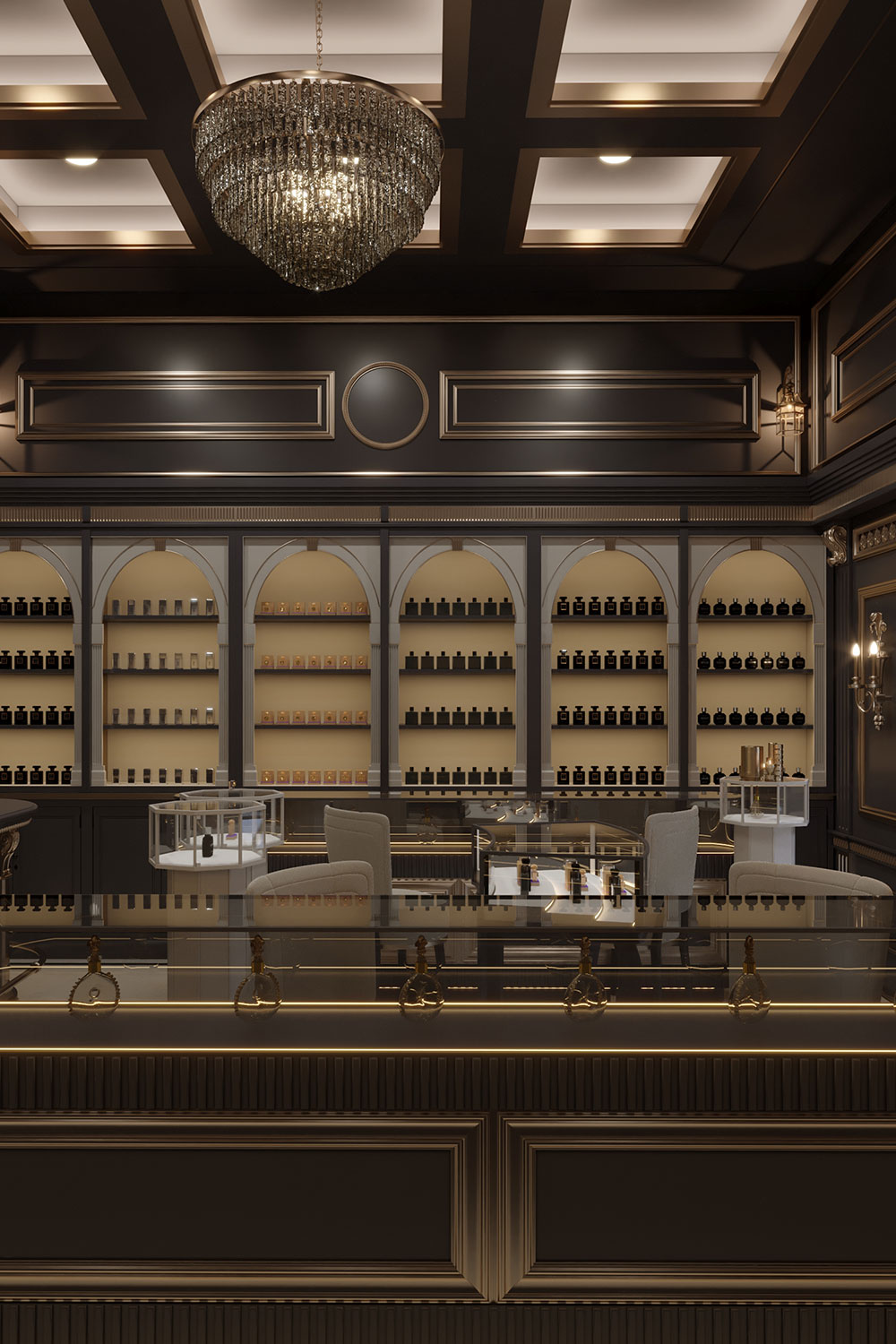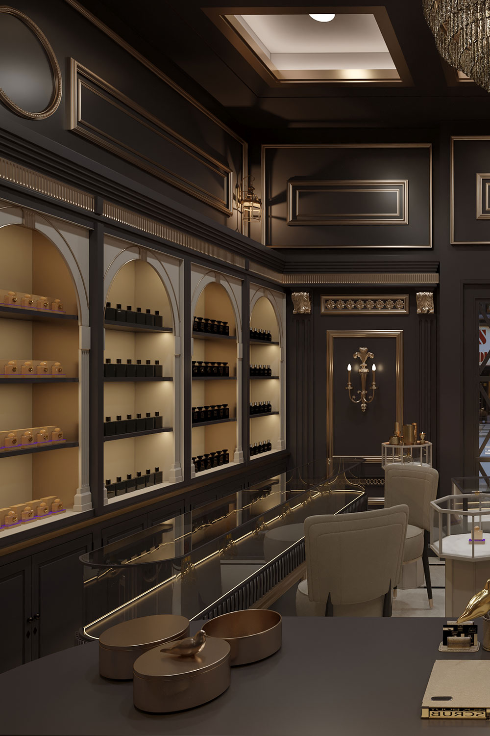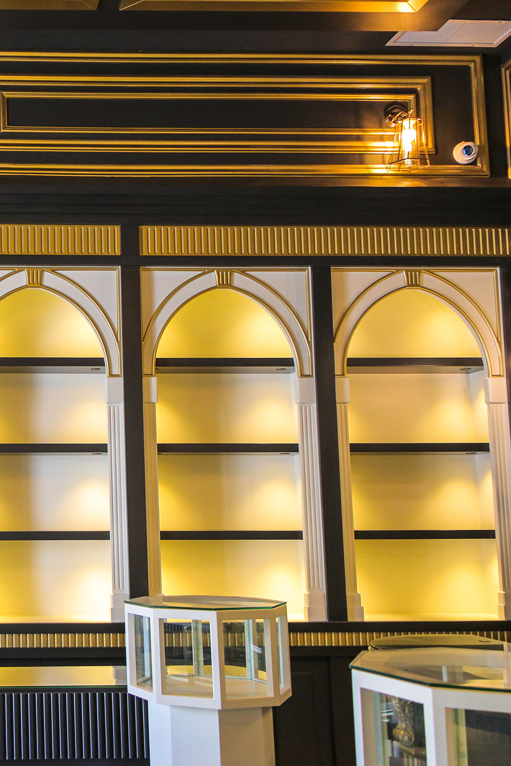 تم العمل على تنفيذ هذا المشروع بتفاصيله الكلاسيكية والتلبيسات الخشبية التي تميزت بلونها الأسود، واللون الذهبي والتي تعطي هوية المكان و فخامته بدايةً من الواجهة