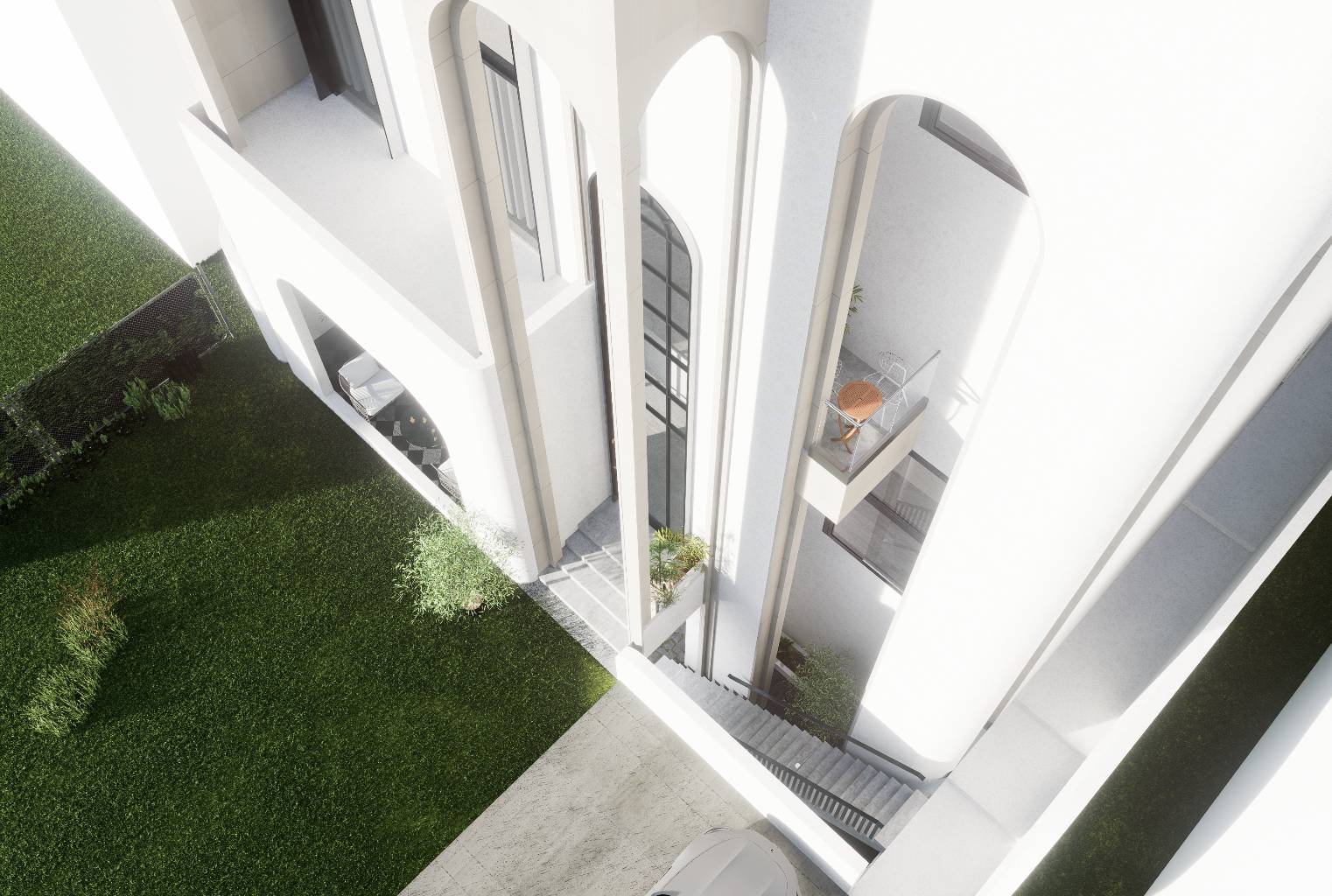 Front elevation : It was created by blending classical and modern design elements by using arches and frames with smooth-edges to provide an elegant and modest elevation.