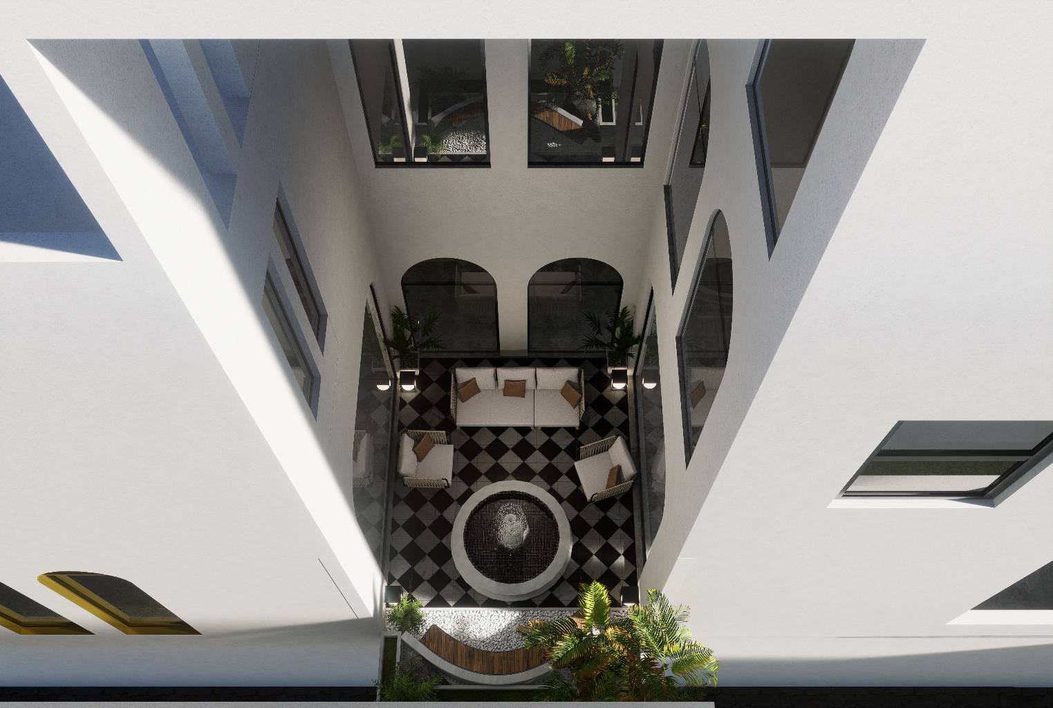 Ground floor: It was designed to mimic the external elevation by utilizing natural color schemes and incorporating a courtyard to allow for natural light and ventilation.