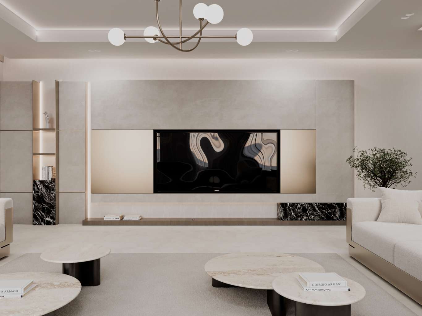 The design incorporates a mix of curved and straight furniture pieces in different colors to create visual interest and prevent the space from feeling monotonous. Balance was carefully considered throughout the project, ensuring that no area feels overcrowded while others remain too simple.