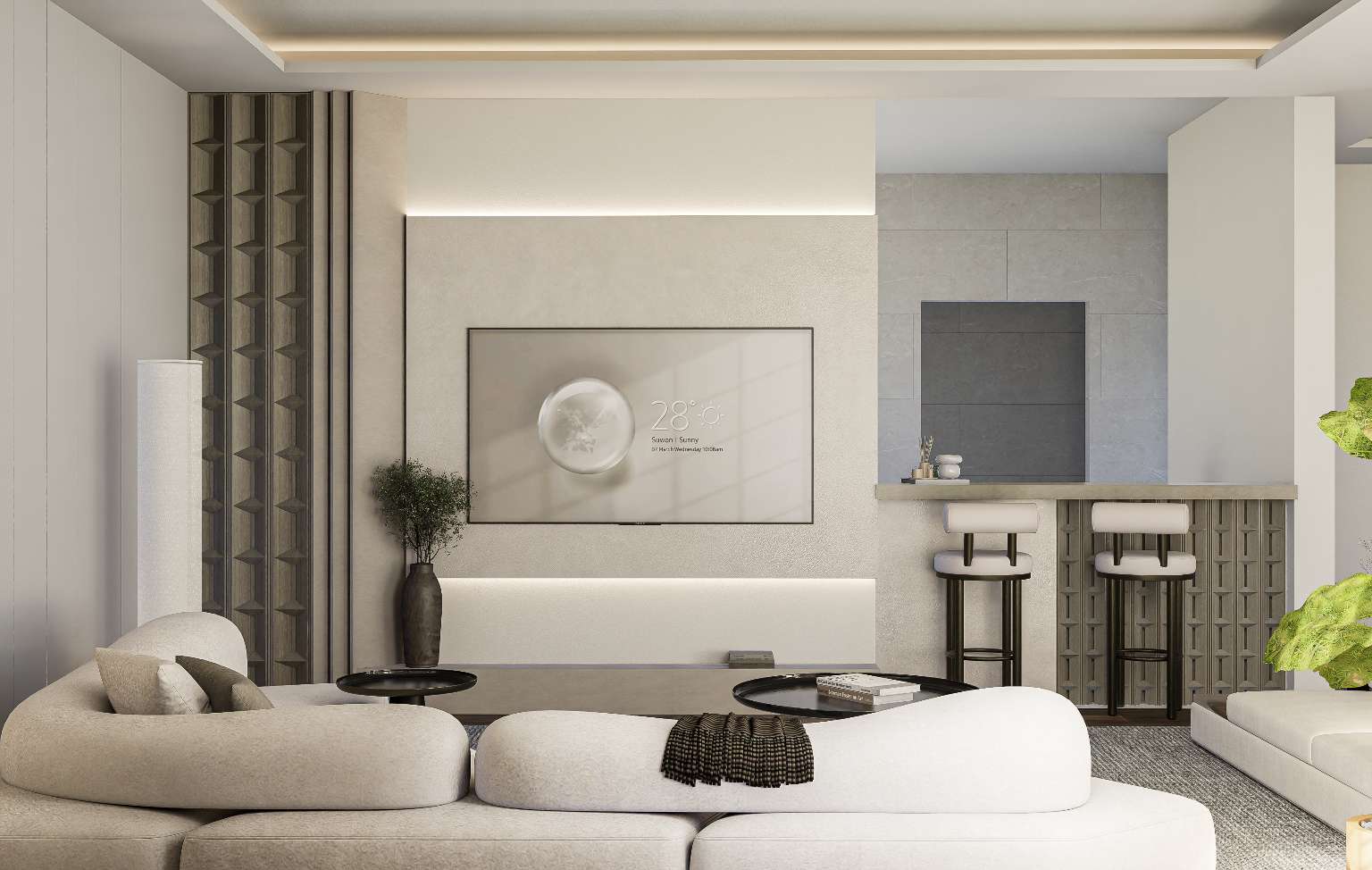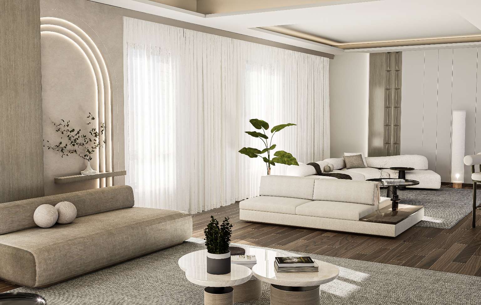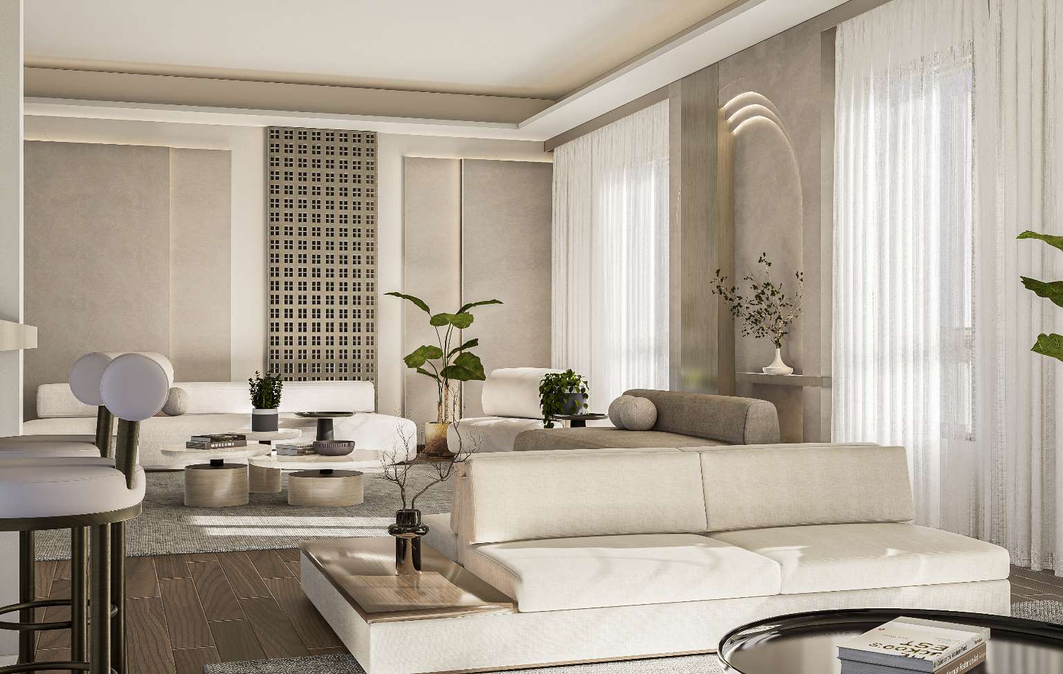 The reception and living room are open to each other to create a smooth and welcoming flow. In the center, we placed a multifunctional bench that serves both spaces, allowing it to be used from the reception side and the living room side. This enhances both functionality and connection between the areas.