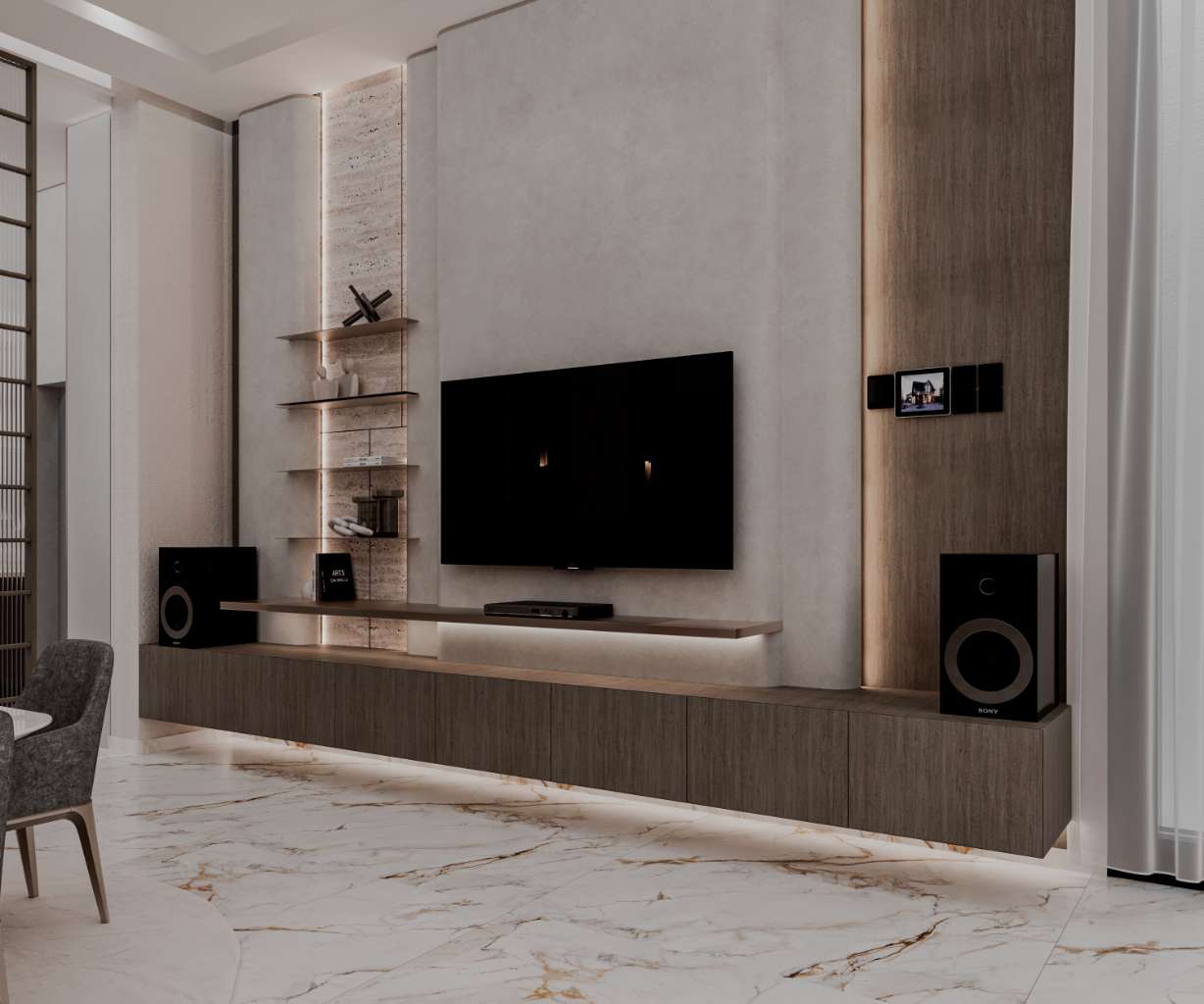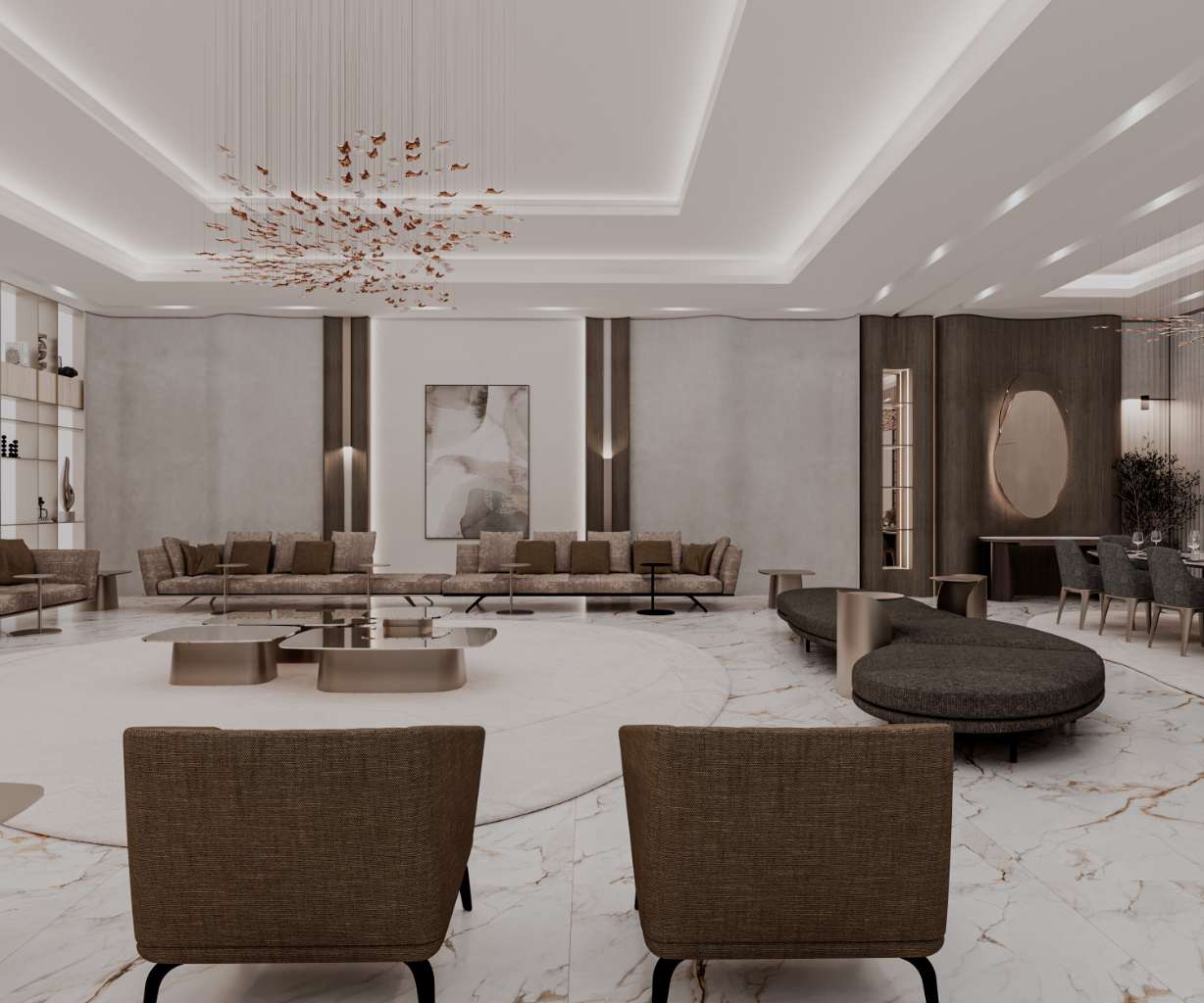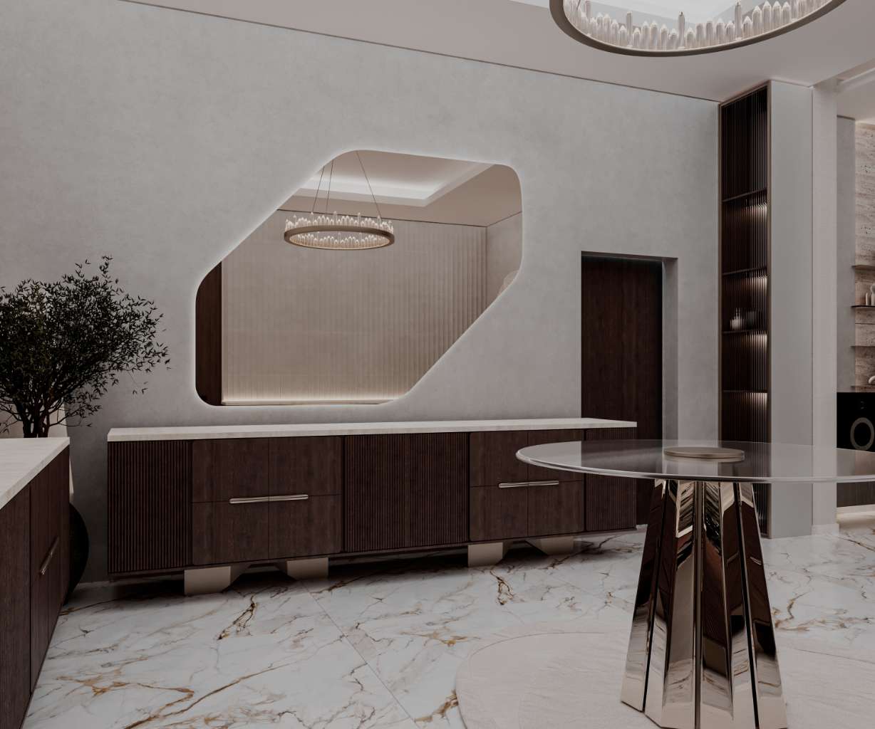 The design combines bronze-gold metal finishes with curved wood elements to achieve a refined and elegant look. Bronze-tinted mirrors were added to increase light reflection and enhance the sense of spaciousness. Additionally, greenery was integrated into a feature wall with a metallic background to amplify reflection .Balance was carefully considered between the walls. One wall features detailed design elements, including travertine shelves, while the opposite wall is kept simpler with subtle design touches and a dining area that creates a kingly ambiance for guests.