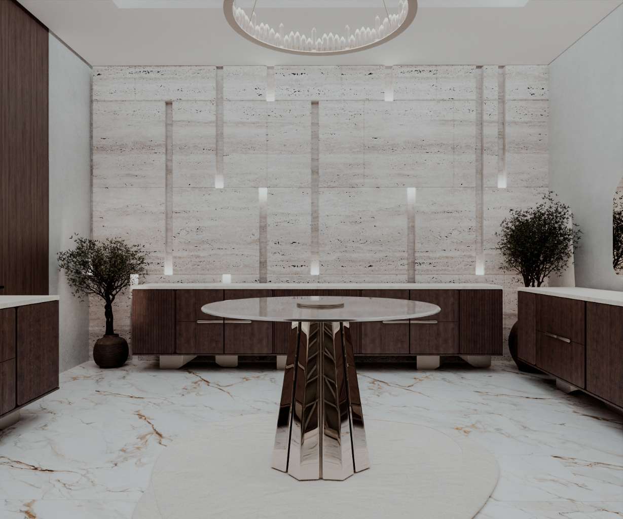 The buffet area is separated from the dining space by a sliding door, allowing it to be opened when in use and closed when not needed. The buffet includes ample cabinetry to ensure sufficient storage. The main wall is finished in grooved travertine with integrated lighting, creating a sophisticated hotel-style atmosphere.