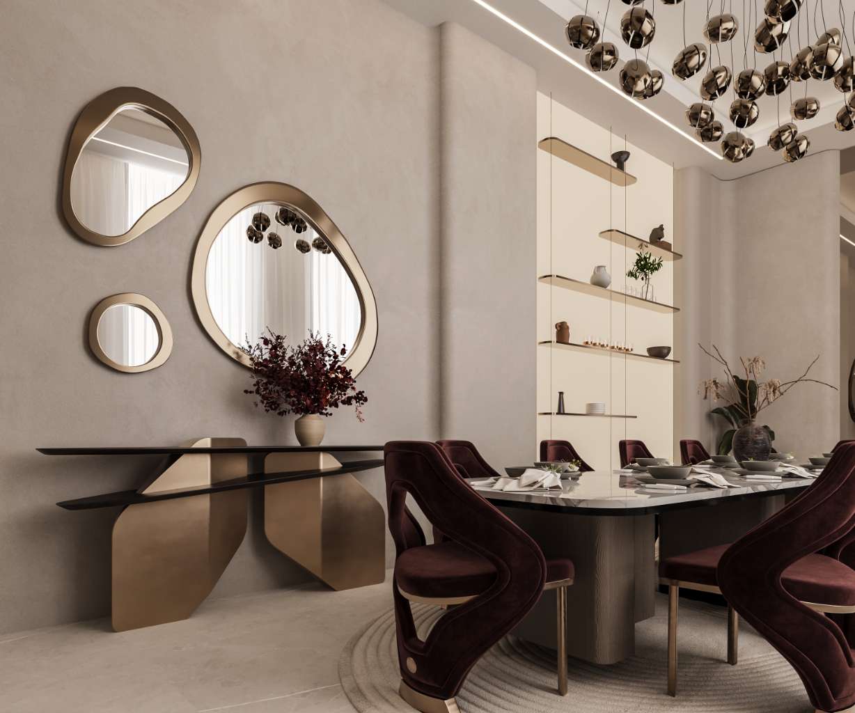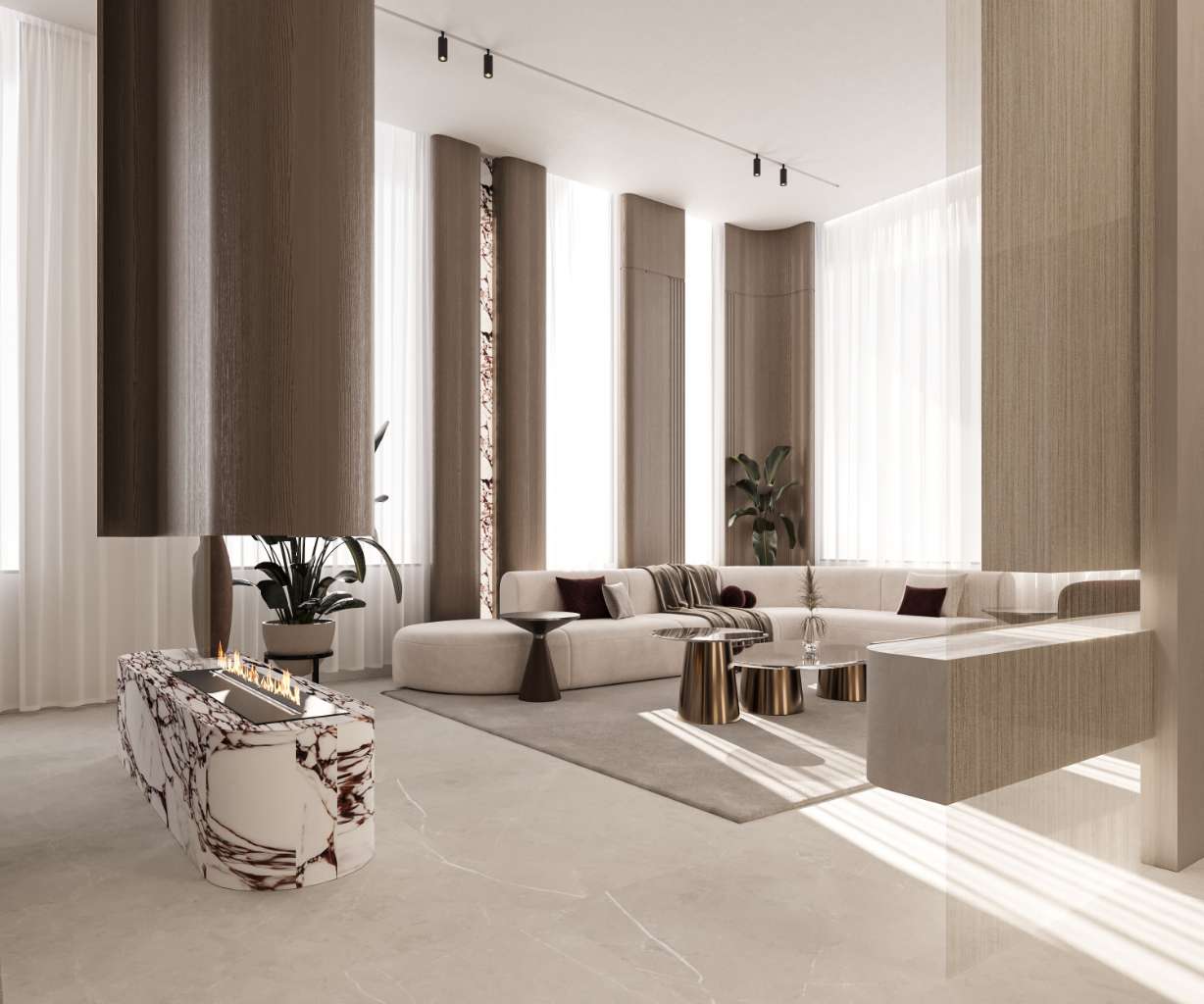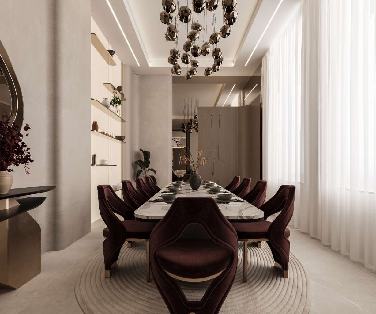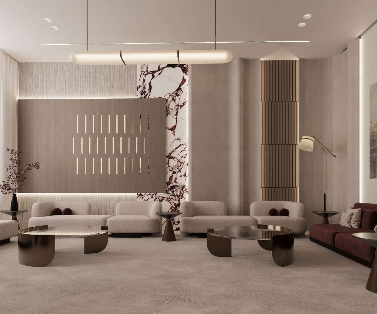 The main function of the house is the reception area, which was designed with a framed architectural feature to create a welcoming entrance for guests. This space incorporates curved walls and Viola marble as focal elements, ensuring visual impact while maintaining balance between materials throughout the design.