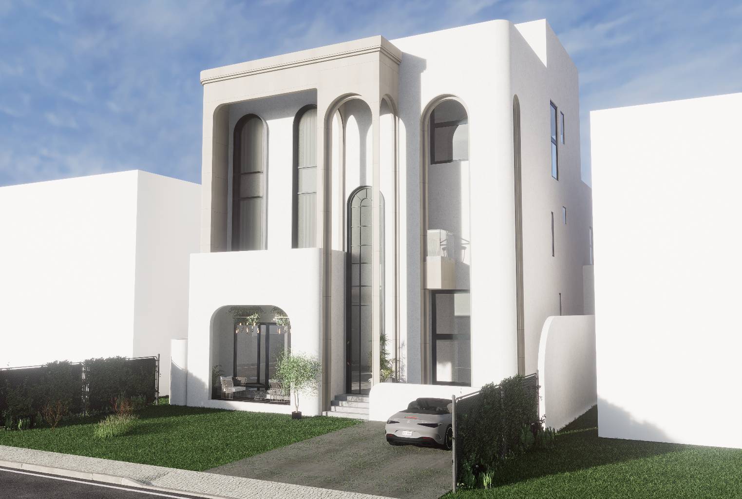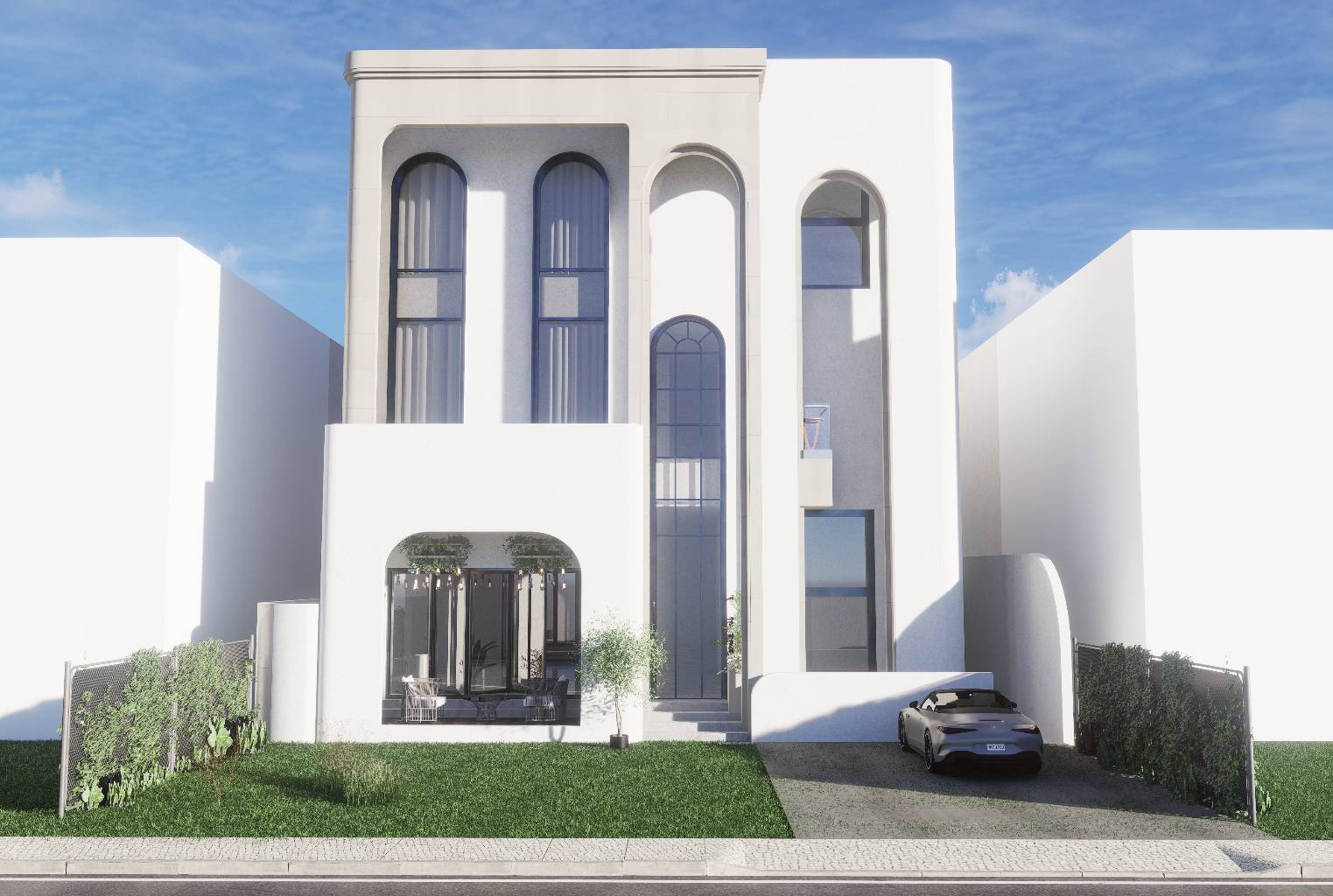Front elevation : It was created by blending classical and modern design elements by using arches and frames with smooth-edges to provide an elegant and modest elevation.