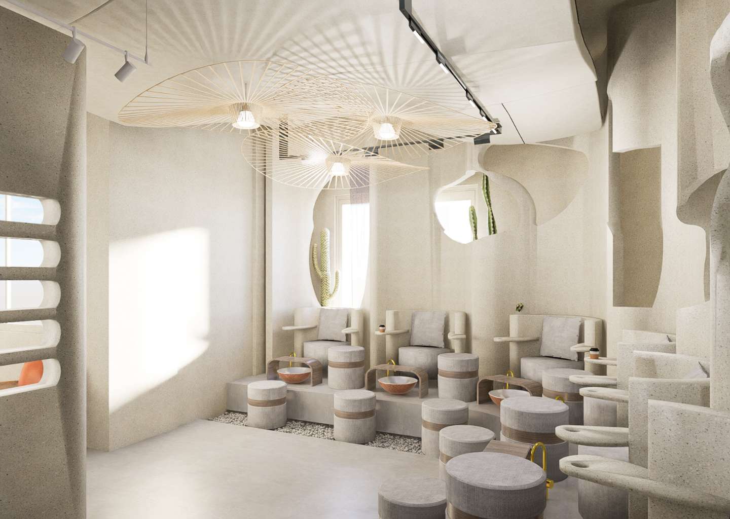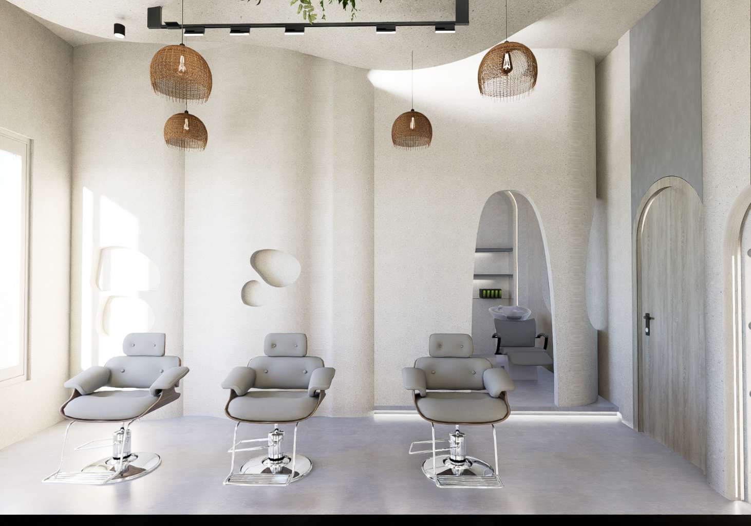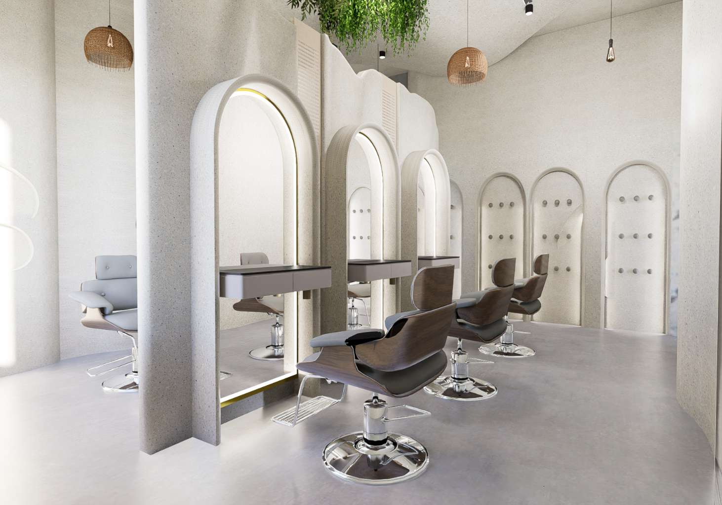 Abstract shapes are incorporated throughout the design, from furniture to decorative elements, giving the salon a unique identity and artistic flair. These organic forms, combined with the warm and inviting atmosphere, evoke the charm and simplicity of a village-style beauty salon while maintaining a modern and sophisticated aesthetic.