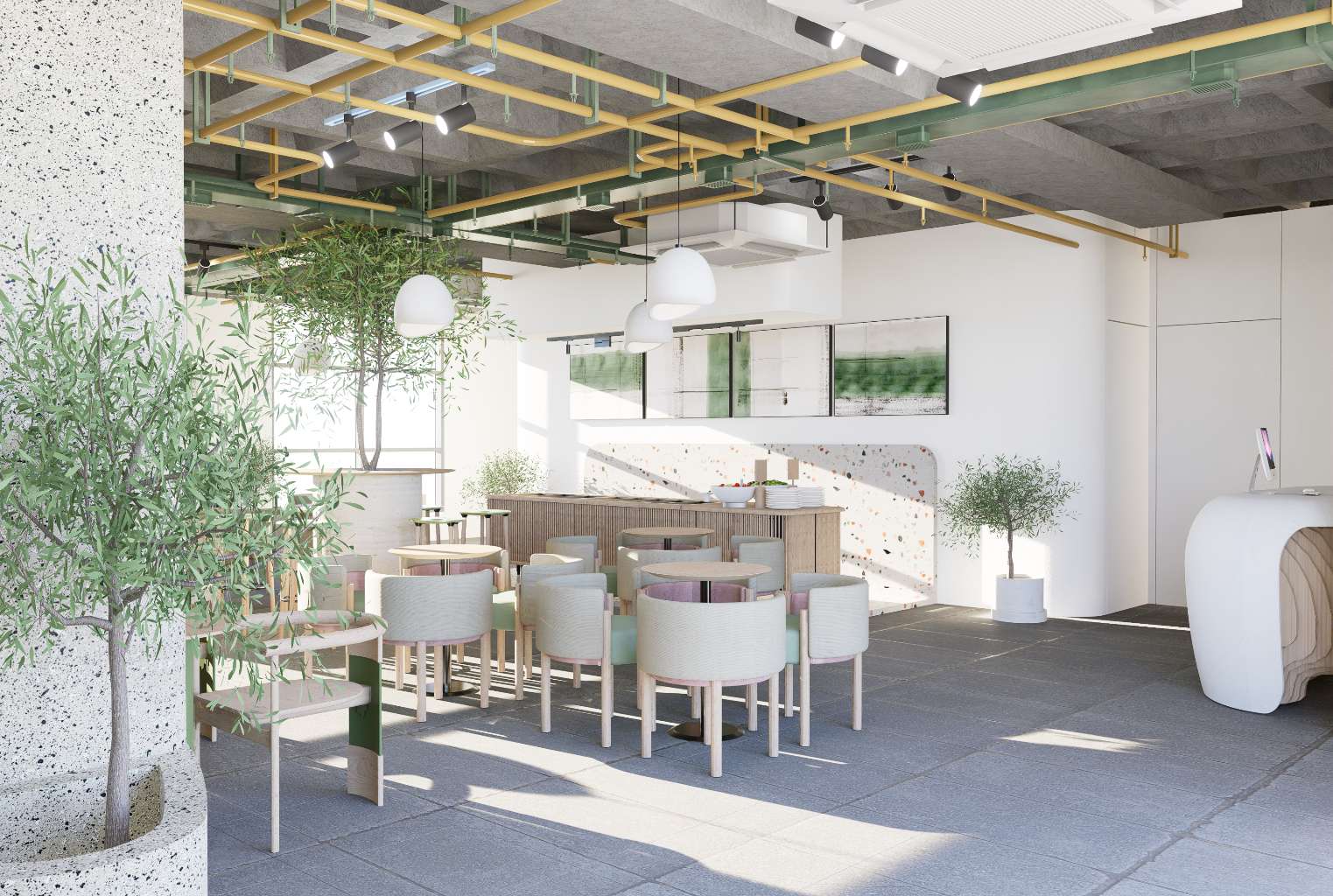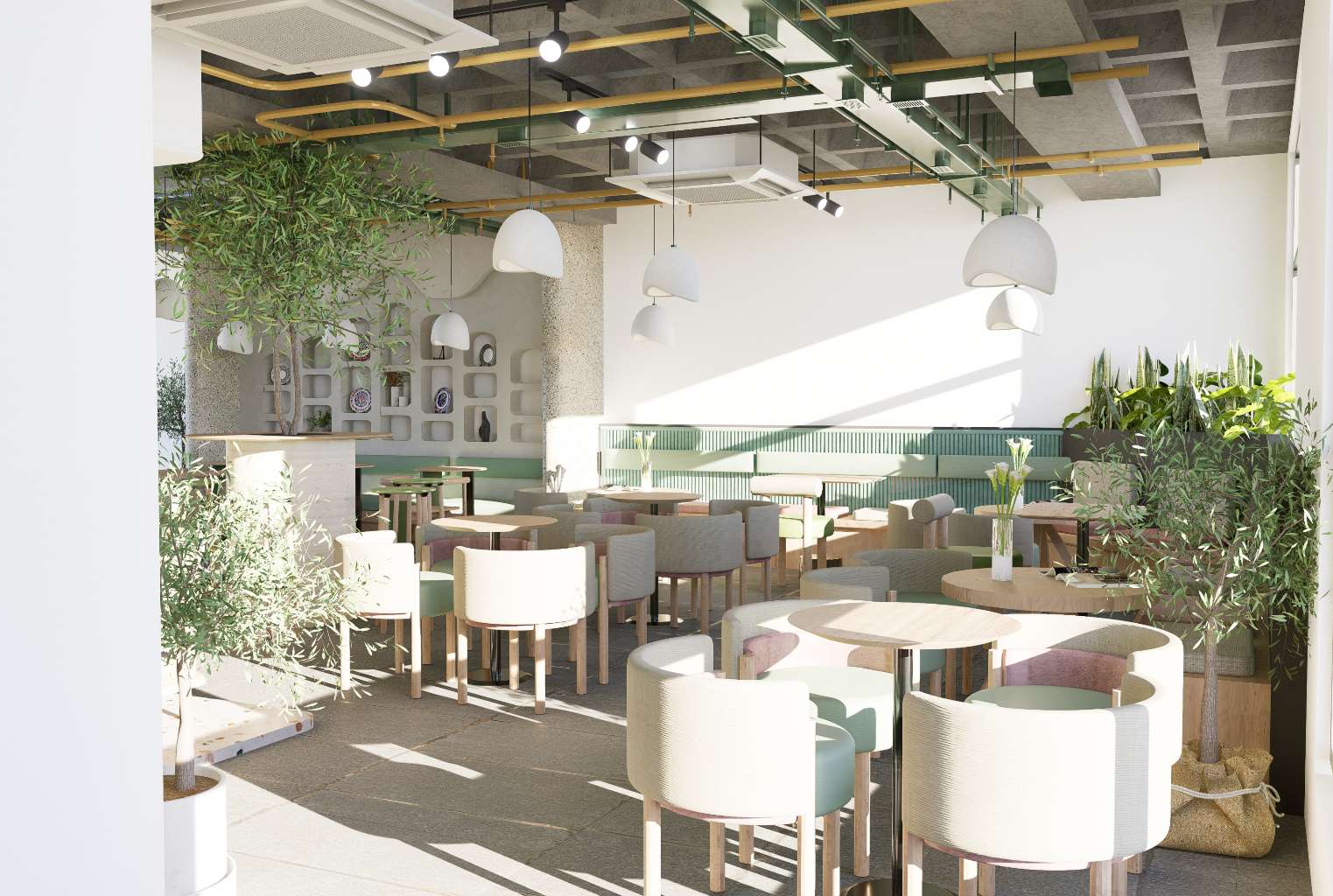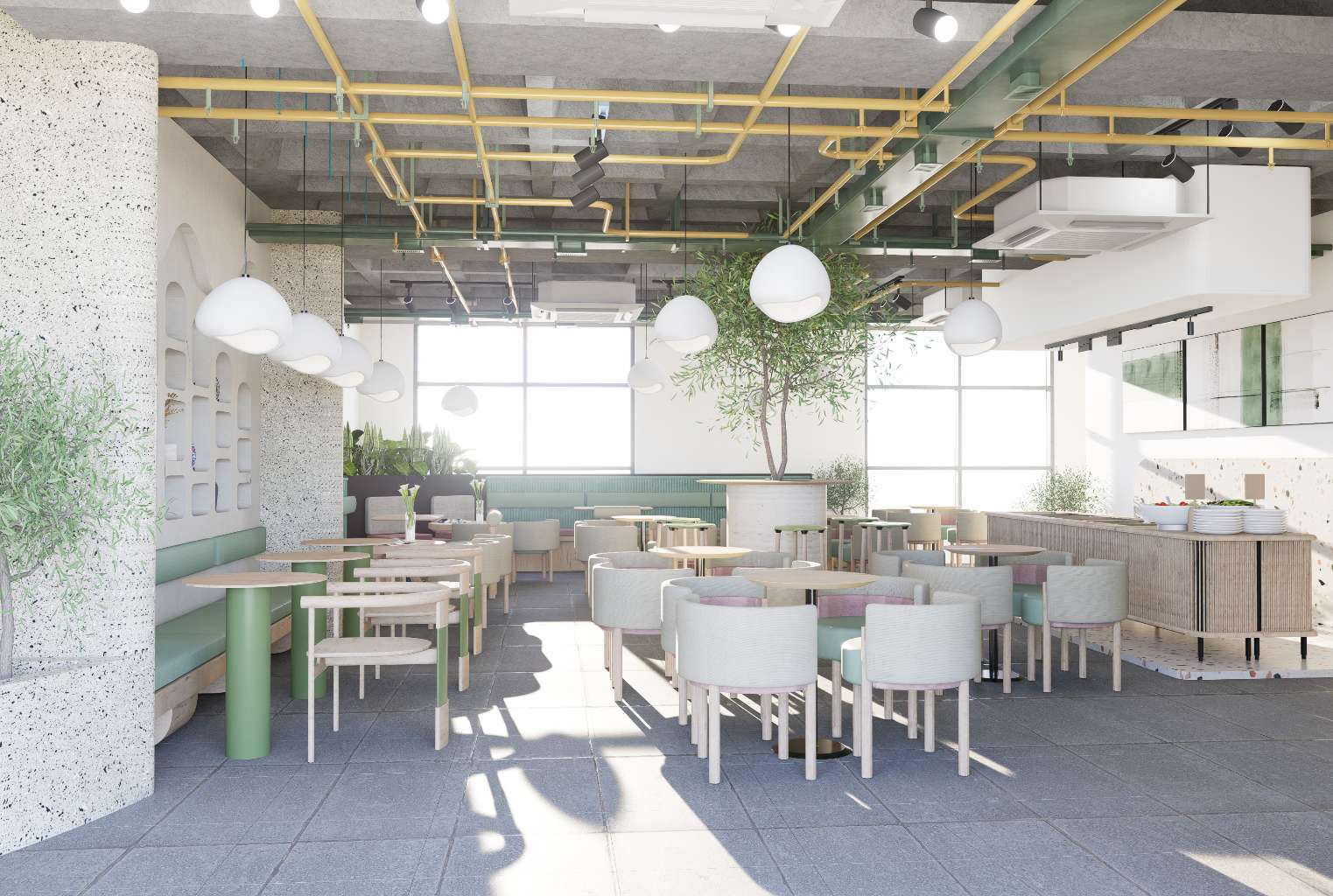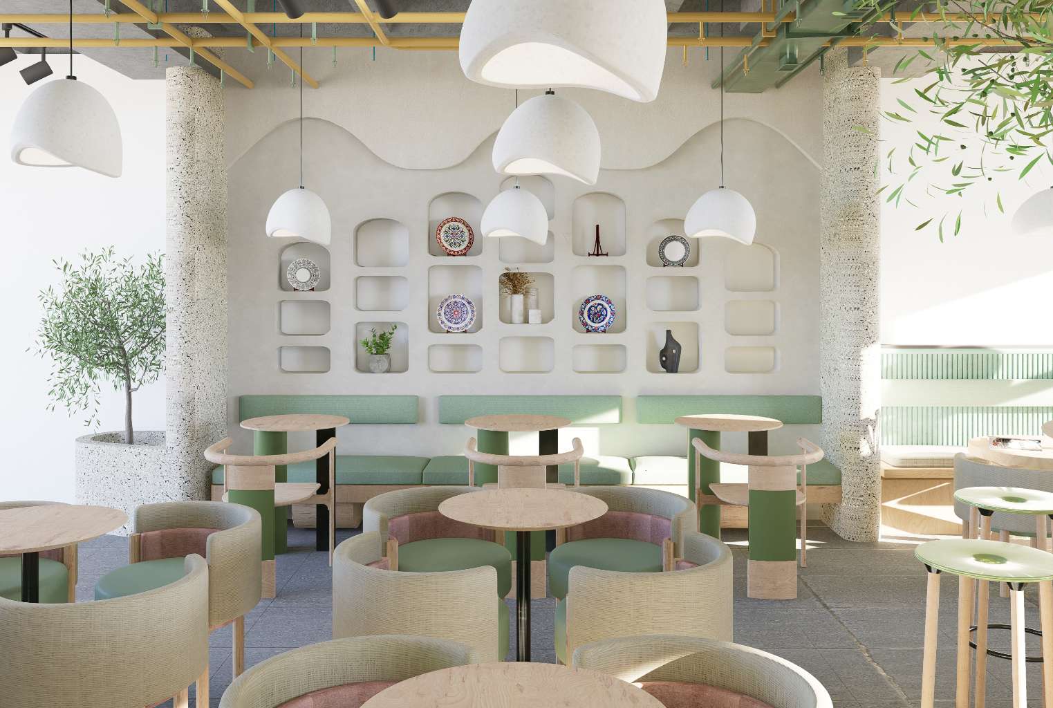 The goal of this project is to design a restaurant that immerses visitors in a natural and organic environment. The concept draws inspiration from the fluid forms and patterns found in nature, translating them into soft, flowing architectural lines and interior details.